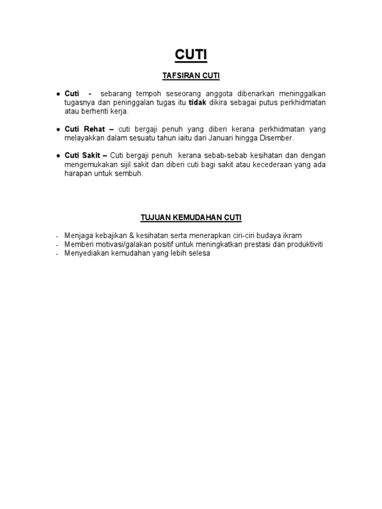 Sijil cuti sakit tidak akan diberi kepada individu yang kelihatan sihat, gagal memberikan sejarah penyakit dengan lengkap, selain tidak mempunyai alasan yang kukuh untuk tidak menghadiri sesuatu aktiviti yang seharusnya diikuti. Cuti sakit diberi oleh ketua jabatan atau kuasa tertentu apabila disahkan sakit oleh pegawai perubatan berdaftar, lembaga 1. Teknologi maklumat dan komunikasi (ict) versi 1.0. Cuti bermakna sebarang tempoh seseorang staf itu dibenarkan meninggalkan tugasnya dan peninggalan tugas itu tidak dikira sebagai putus perkhidmatan atau berhenti kerja. Garis panduan perolehan perkhidmatan personel mystep.